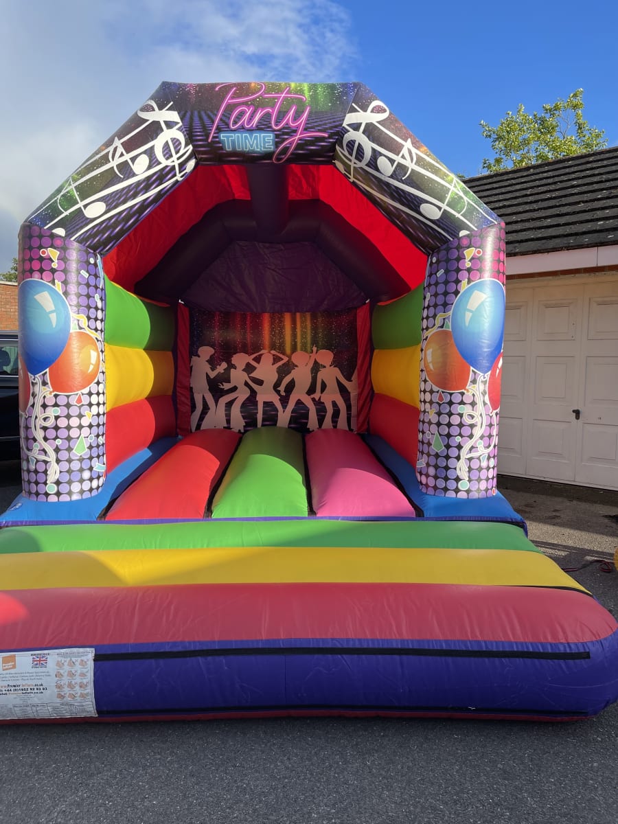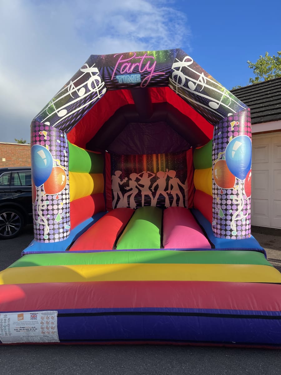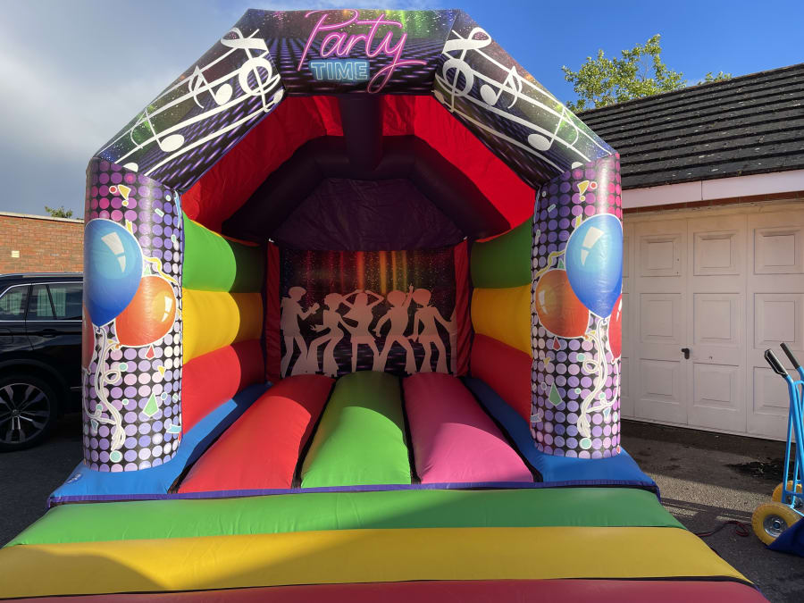 A very colourful and vibrant medium-sized bouncy castle with enough space for small groups to jump around safely, and a roof to keep off light rain or - hopefully - the hot summer sun!