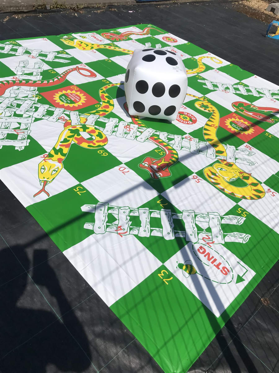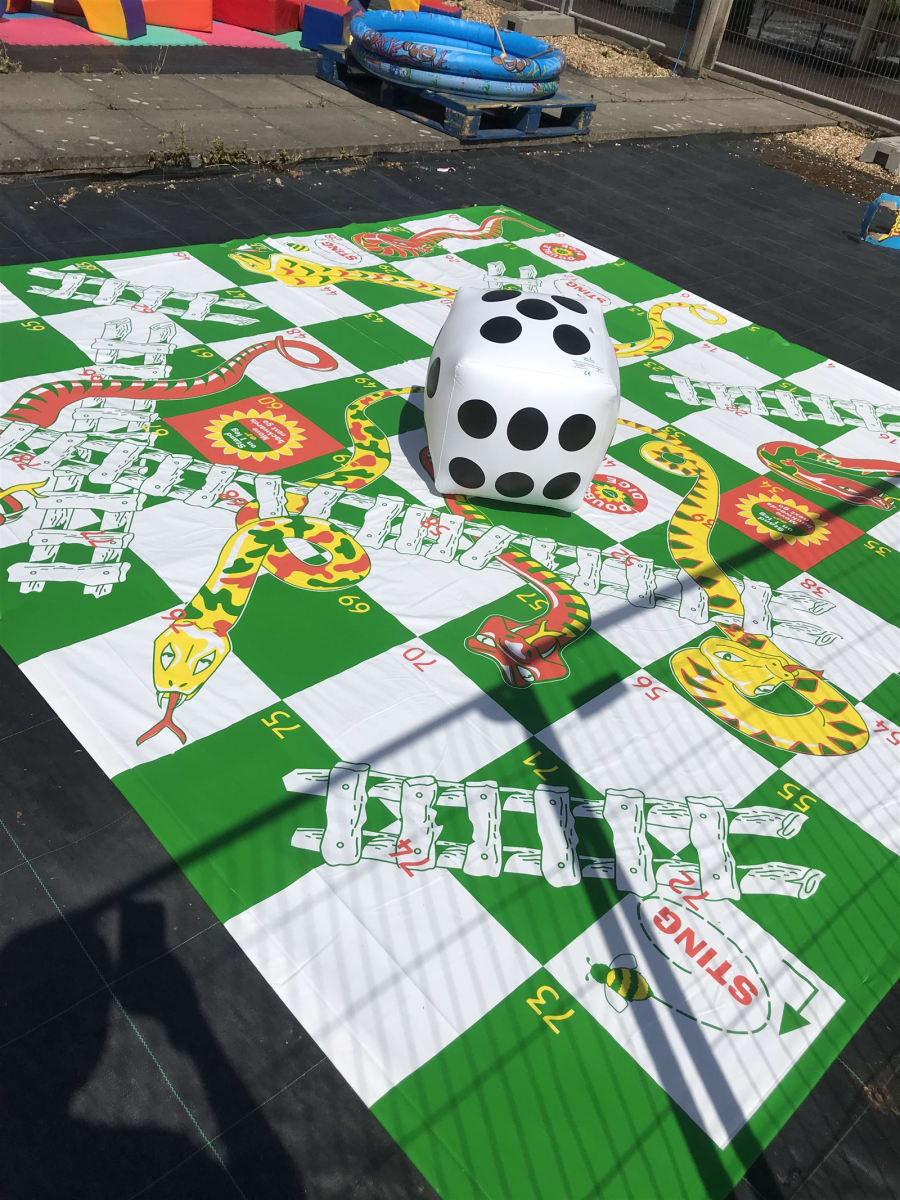 We've also added some new Snakes and Ladders features for extra fun! The Giant Snakes and Ladders set contains a giant playing mat 3m square (10ft square), 8 pegs and a giant snakes and ladders inflatable dice.